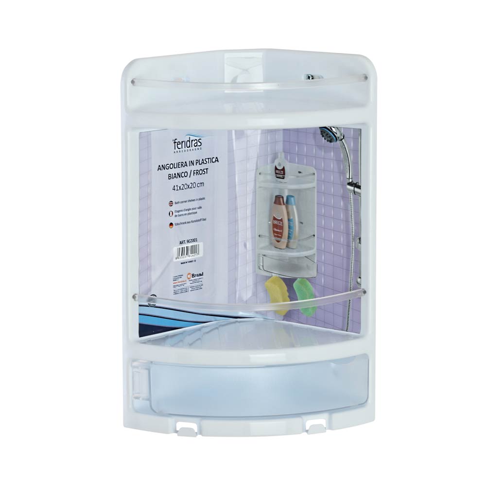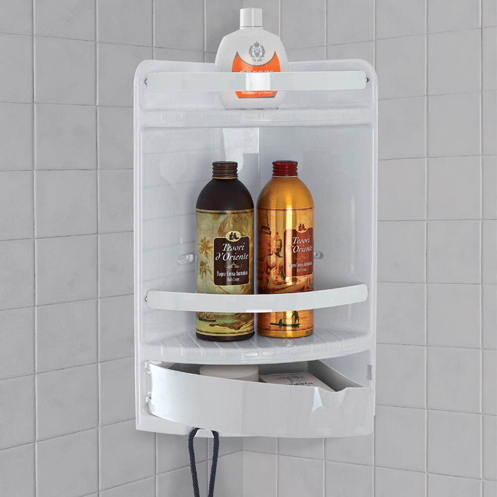 Mensola angolare per doccia 2 ripiani in plastica della linea Ankora di Feridras, con cassetto, ideale per organizzare i tuoi prodotti da bagno.