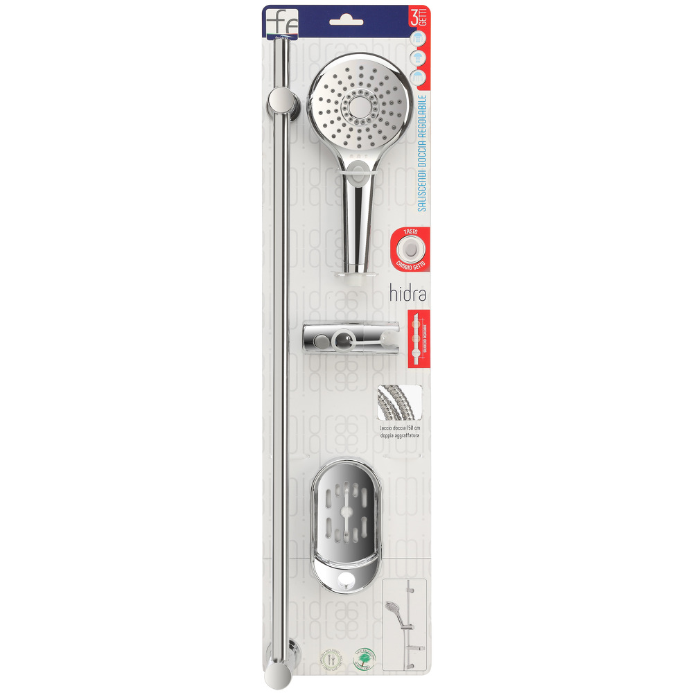 Saliscendi doccia regolabile della linea Hidra di Feridras, dotata di doccetta 3 funzioni con tasto e attacco standard.