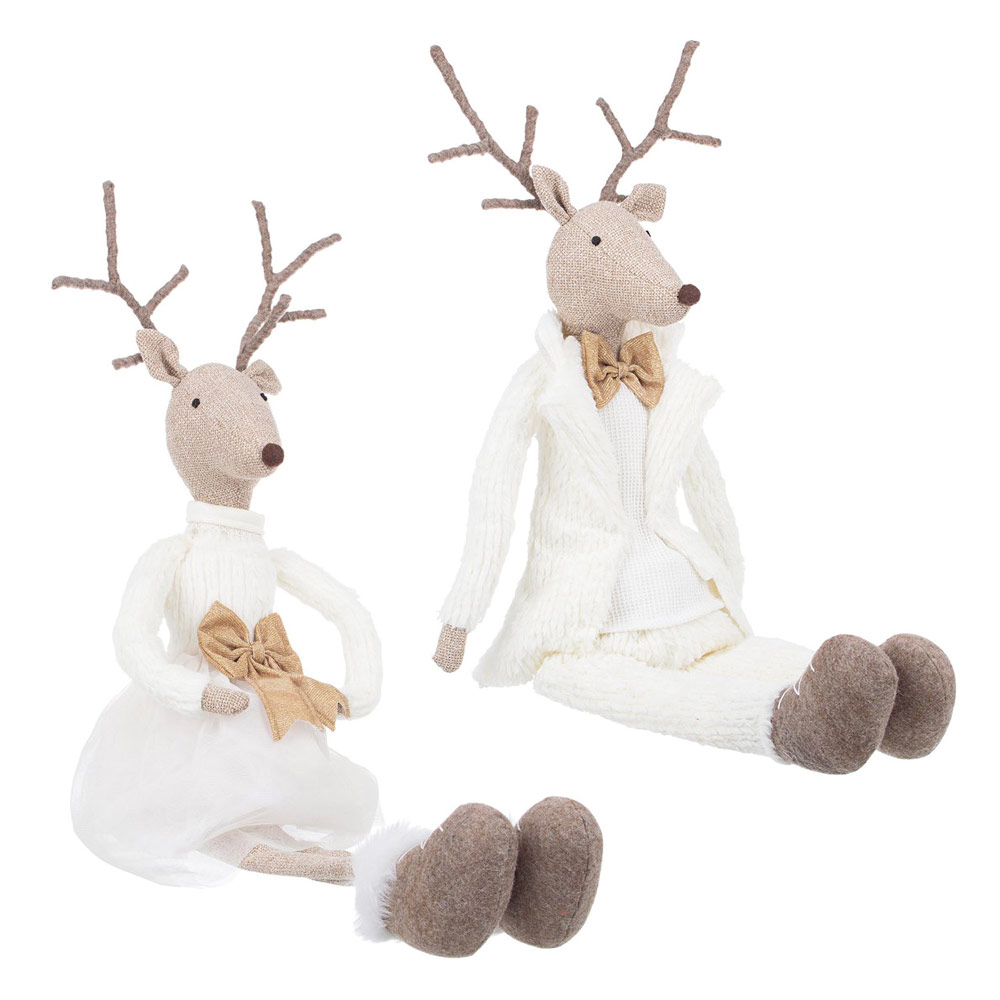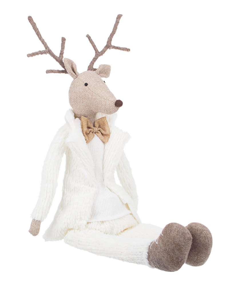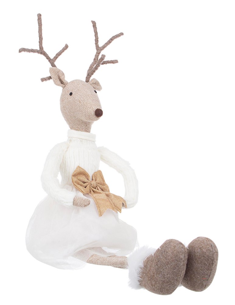Renna di Natale sedutaevestita con abiti bianchi, disponibile sia nella versione con pantalone che con gonna. Una decorazione natalizia molto originale, dai toni delicati, che si presta benissimo in ambienti moderni.