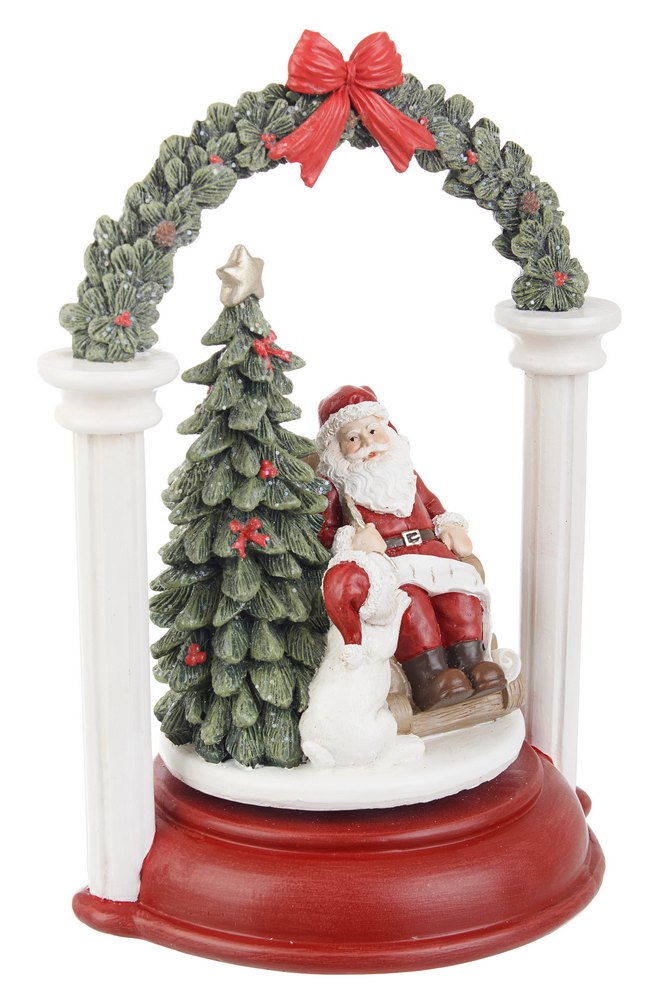 Decorazione natalizia con Babbo Natale sotto un arco addobbato con festone natalizio e fiocco rosso, alto 25 cm.