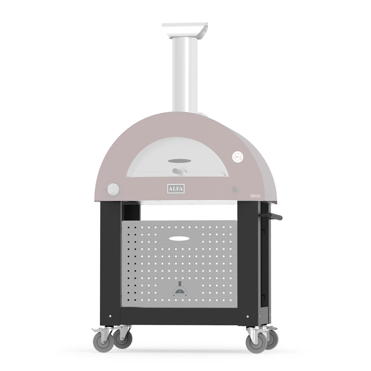 Base per Forno Brio di Alfa Forni dotata di 4 ruote e un ripiano robuosto dove poter adagiare la bombola del gas, o la legna, e ridurre quindi spazi di ingombro negli ambienti circostanti, giardino, terrazza o cucine all’aperto. Il montaggio è rapidissimo e pratico: basterà poggiare il forno Brio alla base ed avvitare i 4 piedini.