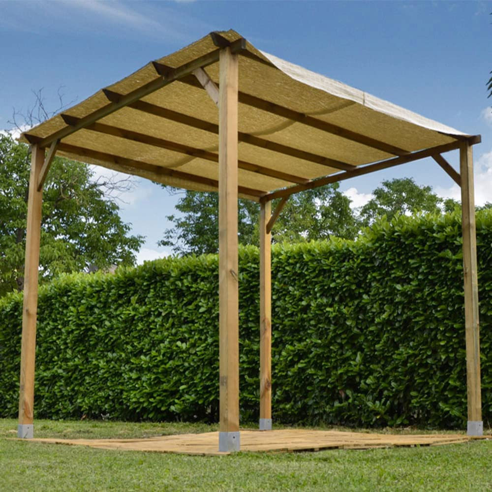 Gazebo a pergola in legno 3×3 senza copertura, ideale per la protezione dal sole in giardini e spazi all’aperto. Leggero ed al tempo stesso robusto, questo pergolato è trattato con impregante ed è privo di copertura, lasciando quindi la possibilità di scegliere in autonomia la migliore protezione da utilizzare, sia essa un telo, un’arella o una pianta arrampicante. Risulta estremamente versatile viste le esigue dimensioni (300 x 300 cm) che permettono di essere posizionato ovunque si voglia.
