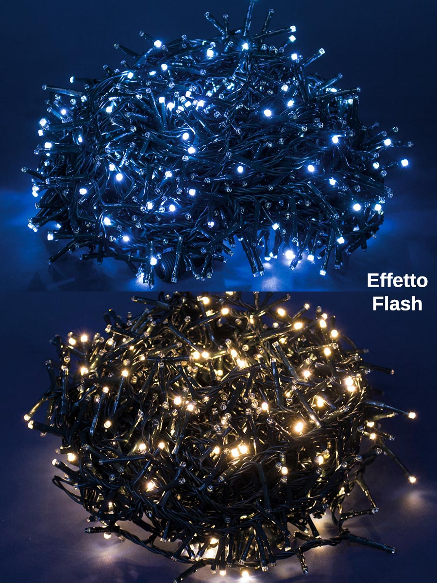Luci di Natale Led ad effetto Flash, intermittente, per uso Interno o EsternoIl cavo ? lungo 10 mt (versione 500 led) o 20 mt (versione 1000 Led) + 5 metri di cavo di alimentazione, sufficiente per raggiungere comodamente una presa elettrica.