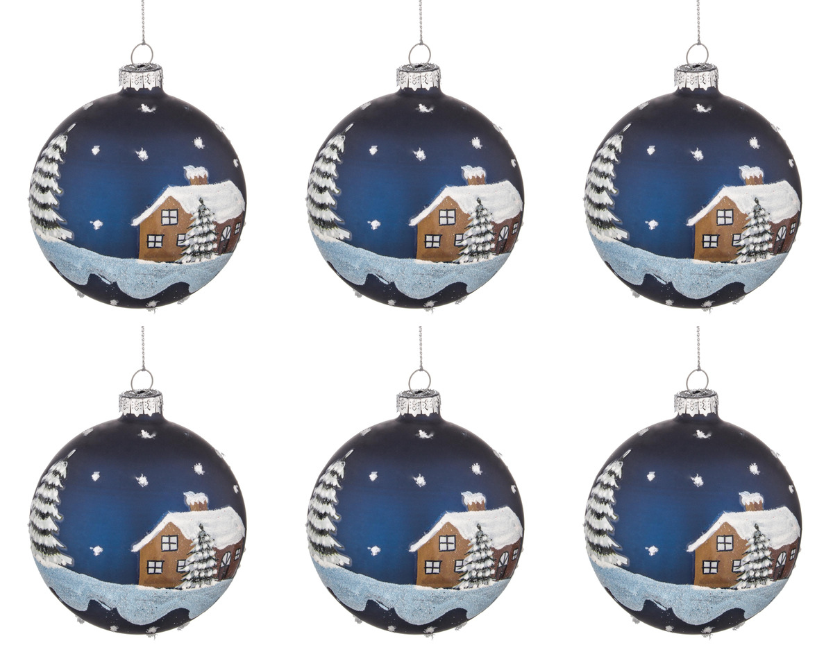 Palle di Natale in Vetro Blu con Casa e Neve