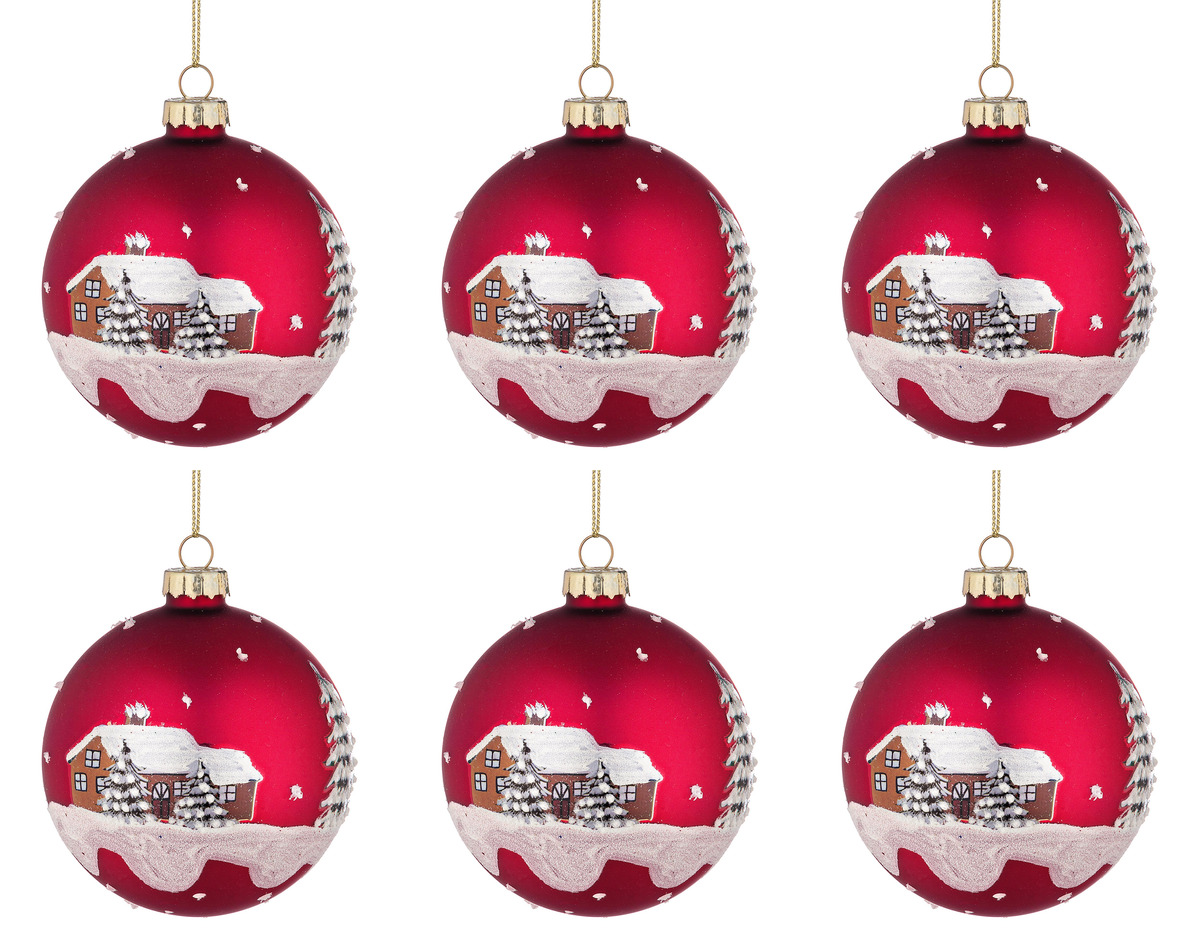 Palle di Natale in Vetro Rosse con Casa e Neve