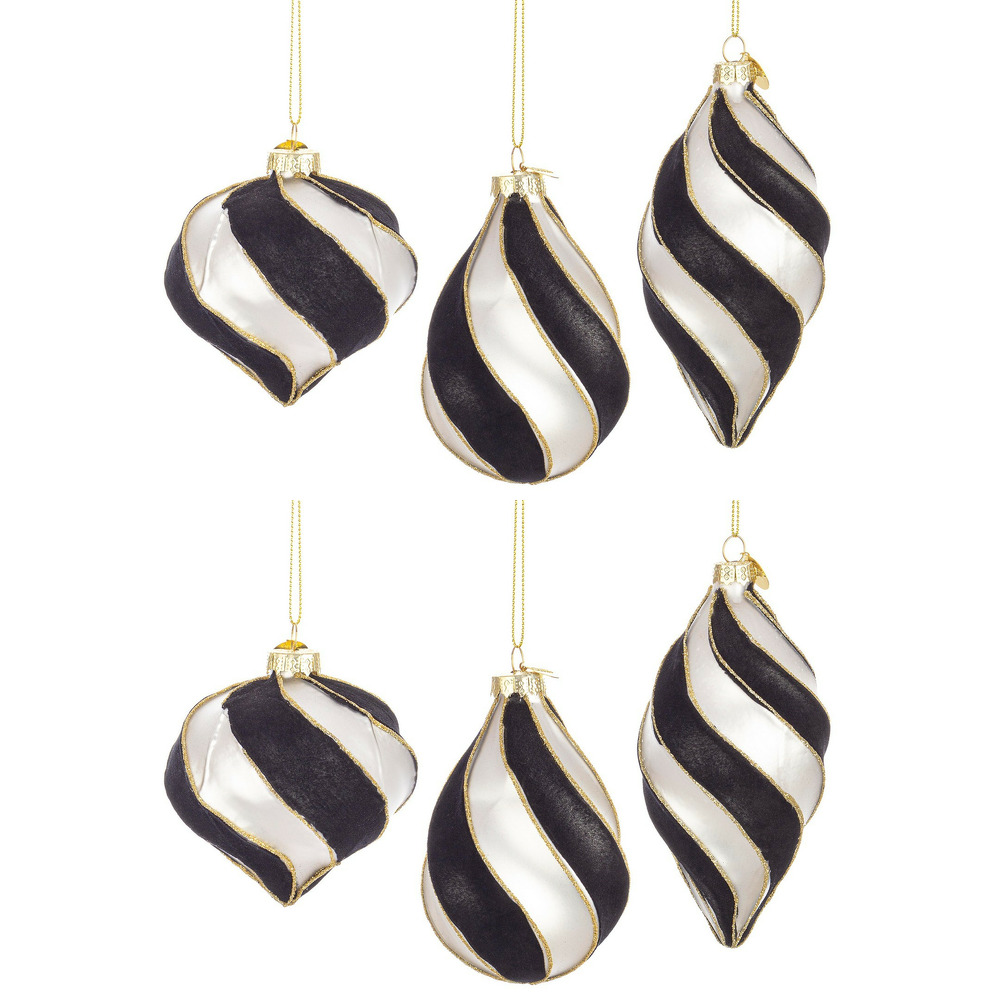 Palline di Natale in vetro Bianco Nero Monochrome con aggancio a occhiello e medaglietta, impreziosito da linee in lurex dorato. Questo Pendaglio di Natale, firmato Andrea Bizzotto è curate nei minimi dettagli e abbellirà il tuo albero di Natale in modo originale. Assortimento di varie forme.