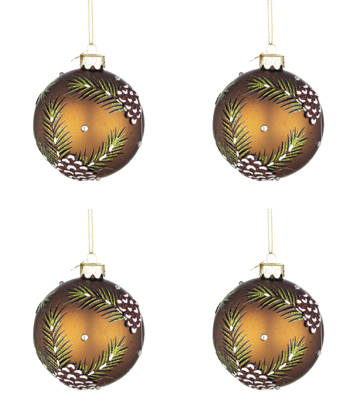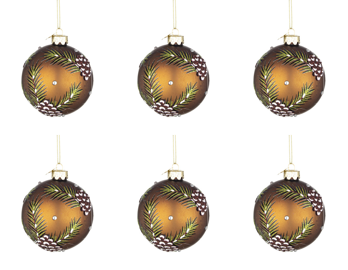 Palline di Natale in vetro di colore marrone decorate con pigne. Disponibili nei formati da 80 o 100 mm