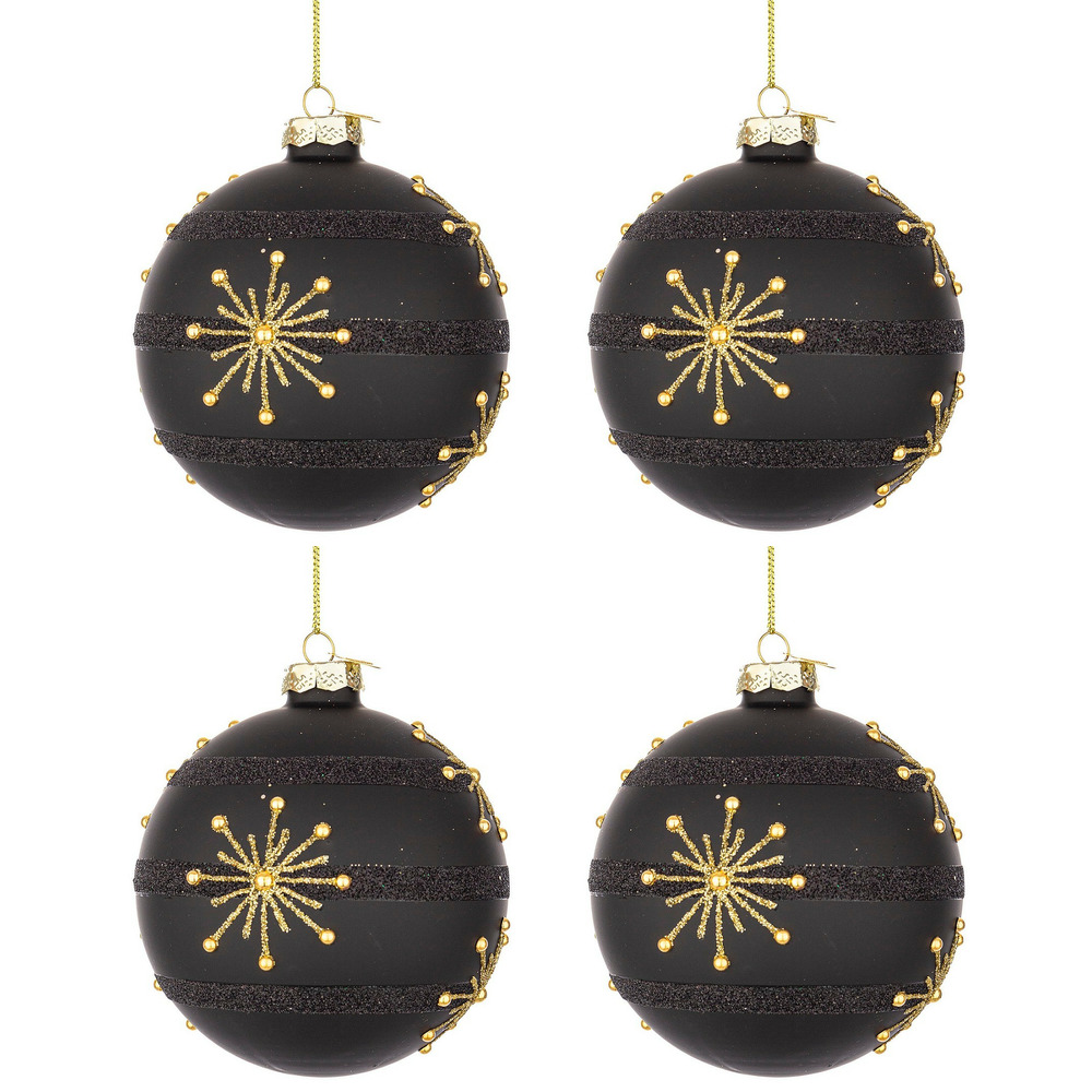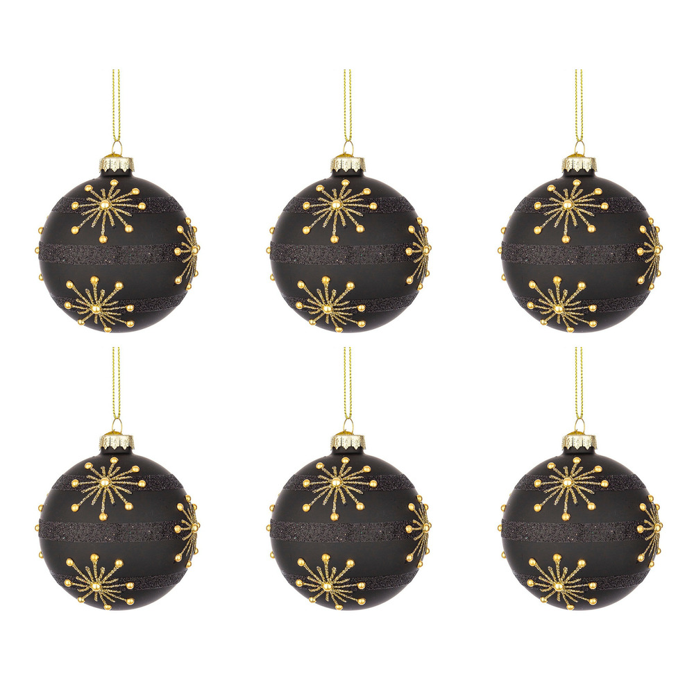 Palline di Natale in Vetro Glimmer colore nero-oro impreziosita da stelle in lurex dorato e perline sulla superficie.