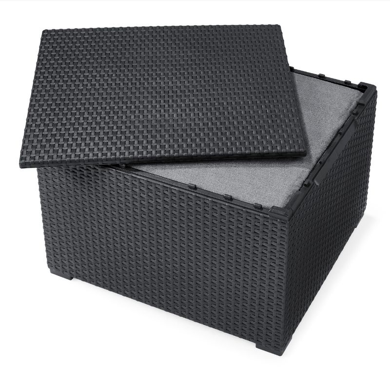 Include 2 poltrone, 1 divano a due posti e 1 tavolo contenitore. La struttura in rattan e i braccioli lisci più il piano del tavolo in resolith sottolineano il carattere individuale del set.