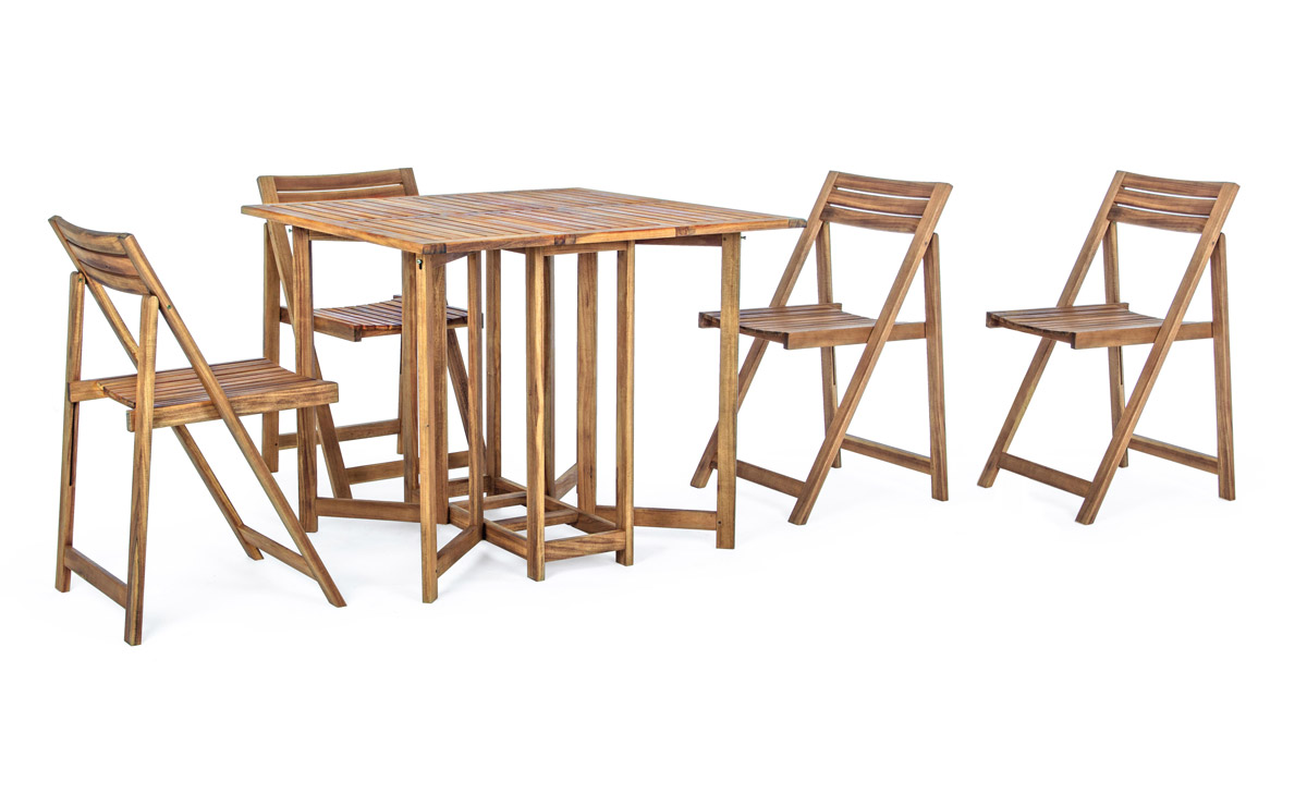 Set composto da Tavolo da giardino e 4 sedie realizzati in legno di acacia, molto resistente. Sia tavolo che sedie sono pieghevoli, il che vi permetterà di occupare pochissimo spazio una volta riposto.