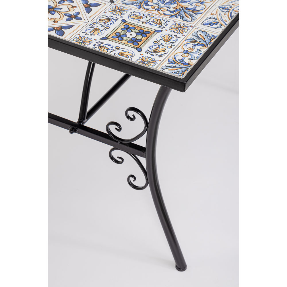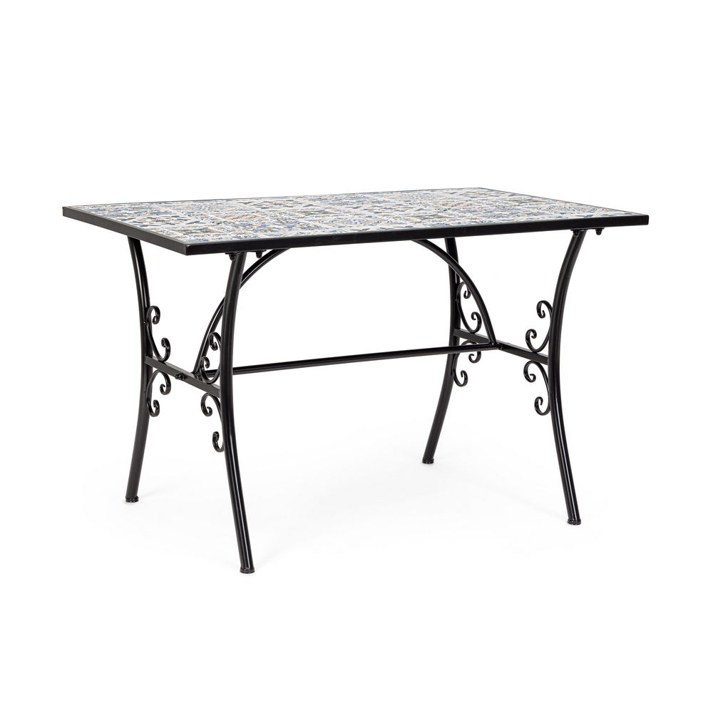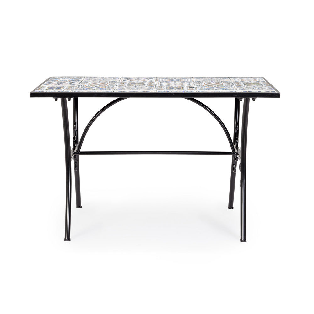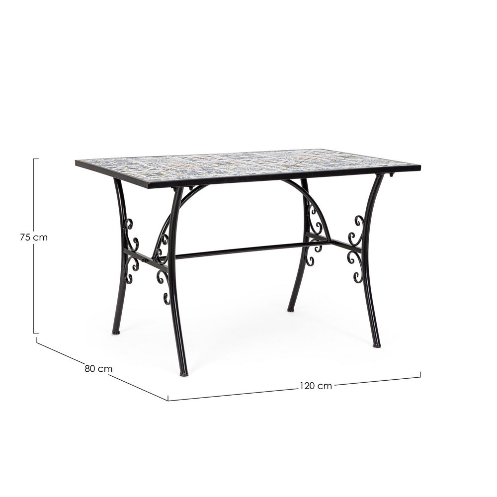 Tavolo da Esterno realizzato con struttura in acciaio e piano rettangolare in ceramica. Ideale in un ambiente rustico, sul vostro terrazzo o in giardino. Disponibile anche il tavolino Mykonos, con lo stesso stile e decorazione, perfette per creare il vostro set completo.