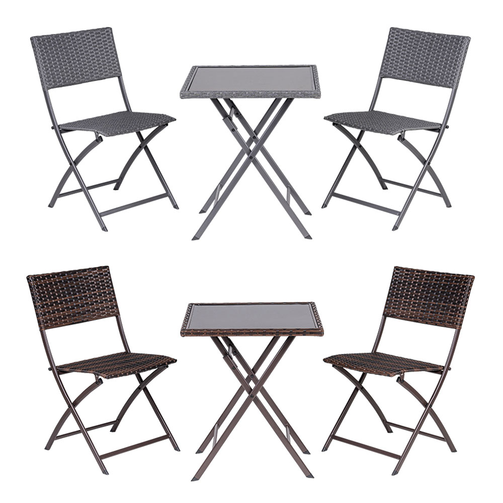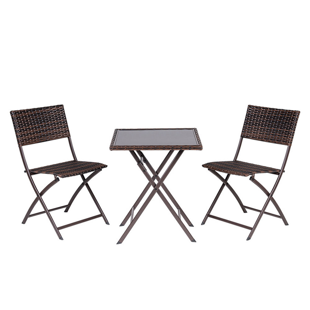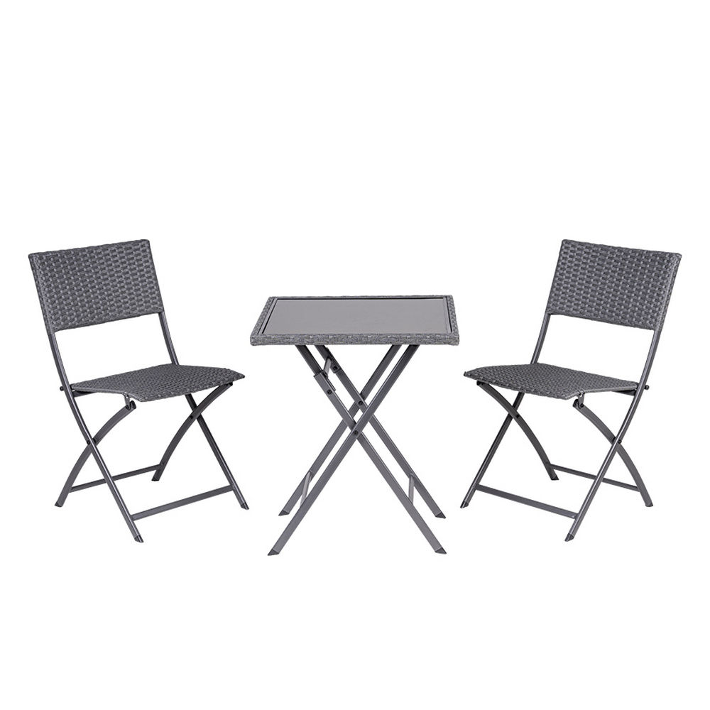 Tavolo da giardino pieghevole con ripiano in vetro e due sedie in rattan, realizzato in acciaio, ideale come complemento d’arredo per il tuo giardino o spazio esterno.