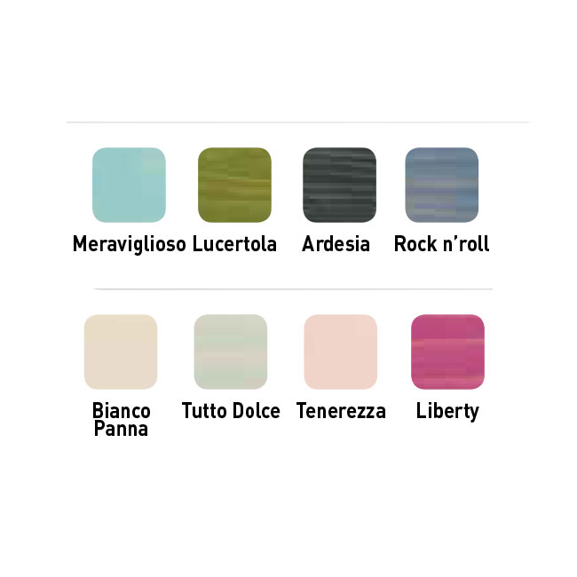 | Colore | Ardesia, Liberty, Lucertola, Meraviglioso, Panna, Rock N Roll, Tenerezza, Tutto Dolce |